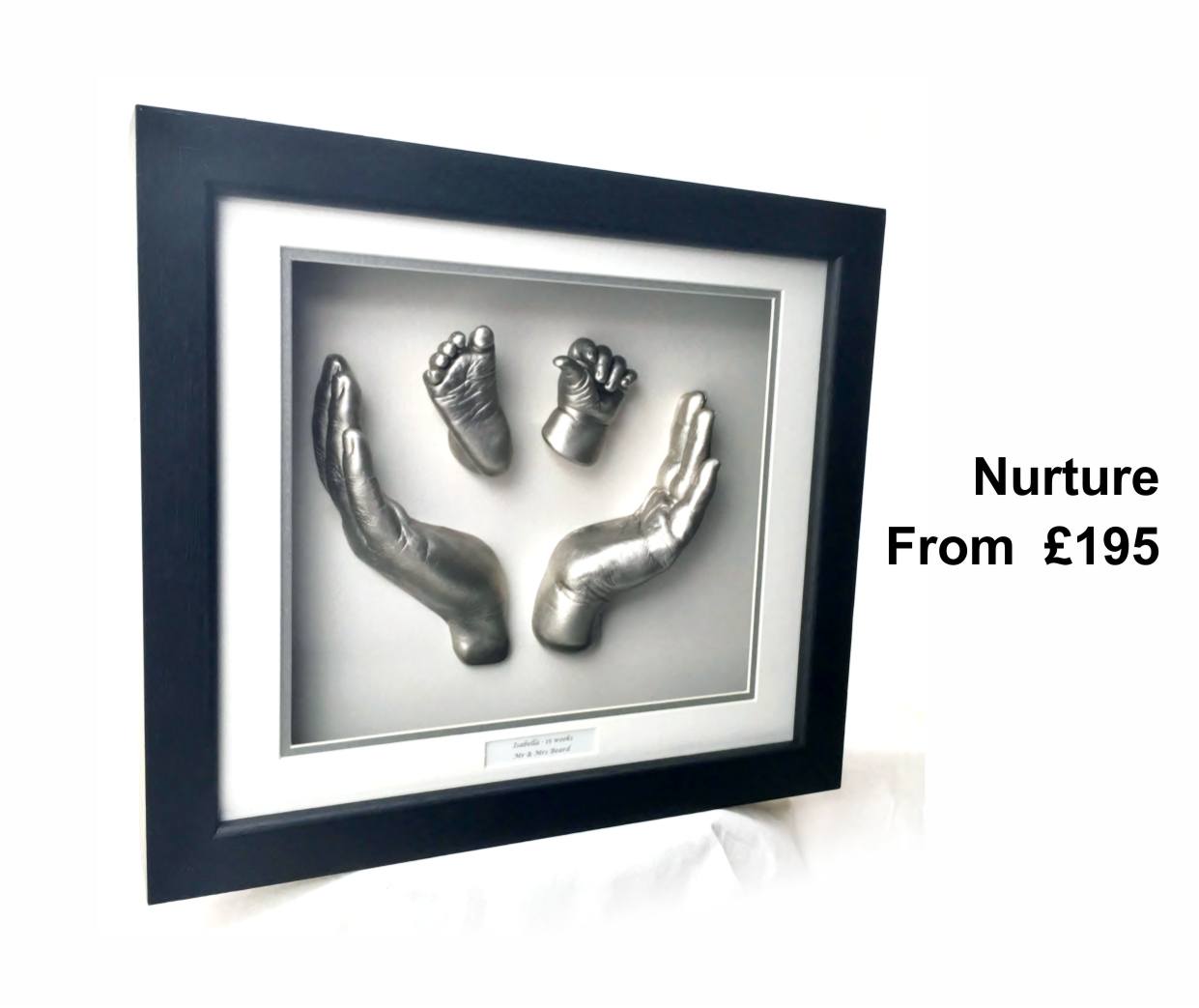 Babyprints offers many designer styles and family combination castings, this beautiful white Swept frame, Antique white and silver mount combo with silver casts is a take on the Babyprints Nurture frame.